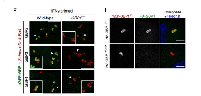 沙门氏菌(以 rsRED 标记,红色)感染 Hela 细胞,细胞内非典型炎症小体 GBP1(以 eGFP 标记,绿色)与沙门氏菌表面结合。细胞核(Hoechst 标签,蓝色),比例尺:10um (C) 5um (F)。设备:带 Airyscan 的 LSM 800。